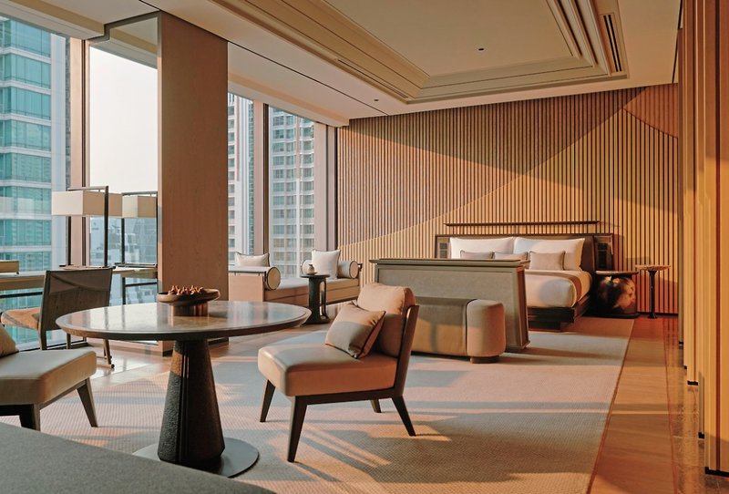 Die 52 Suiten, zwischen der 11. und 18. Etage gelegen, gehören mit zu den größten der Stadt. Stilvoll und geräumig gestaltet, haben alle Panoramafenster, die einen spektakulären Blick über die Stadt und die Gartenanlagen bieten. Mit Kingsize-Bett, Schreibtisch, Bad mit Dusche, Föhn, Flachbild-TV, Telefon, WLAN, Tee-/Kaffeezubereiter, Minibar, Safe und Klimaanlage sowie Erfrischungen und alkoholische Getränke sind inkludiert.