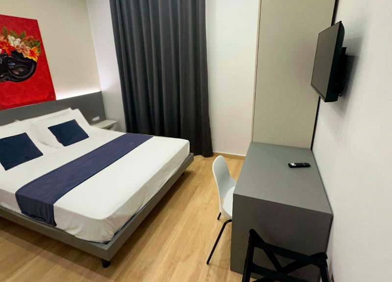 Kompaktes, aber vollständiges Doppelzimmer: Memory-Matratze, antiallergische Kissen, eigenes Bad mit Dusche, Haartrockner und Handtüchern. Ausgestattet mit einem Safe, Minibar und Flachbild-TV für einen entspannenden Aufenthalt.