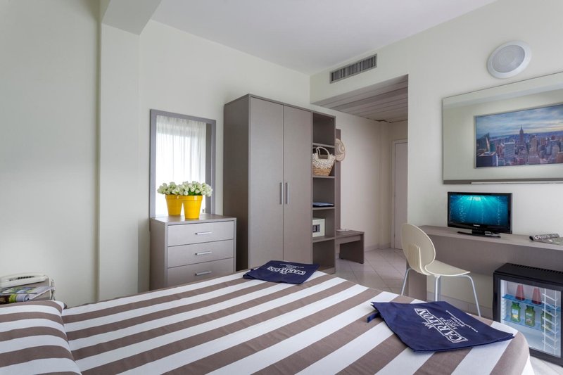 Rooms: Das Hotel Carlton in Riccione bietet elegante und komfortable Zimmer, ausgestattet mit allen modernen Annehmlichkeiten. Jedes Zimmer ist geschmackvoll eingerichtet und verfügt über Services wie kostenloses WLAN, Klimaanlage und einen Flachbildfernseher. Einige Zimmer verfügen über Balkone mit Meerblick, ideal um die Aussicht zu genießen. Die Gäste können aus verschiedenen Zimmerkategorien wählen, von Standardzimmern bis hin zu geräumigeren Familienunterkünften. Die Atmosphäre ist einladend und entspannend, perfekt für einen unvergesslichen Urlaub an der Riviera Romagnola.