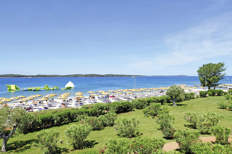 Der knapp 1 km lange gepflegte Kiesstrand schließt sich direkt an die Anlage an, Entfernung je nach Unterbringung 250-600 m. Der Strand ist mit der „Blauen Flagge“ ausgezeichnet, welche für ein sauberes, gepflegtes Küstengebiet mit hervorragender Wasserqualität steht. Sonnenschirm- und Liegestuhlverleih und Aquapark am Strand.